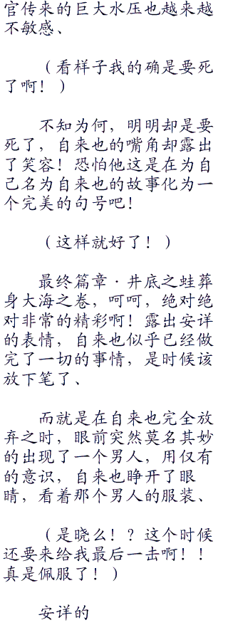 当佩恩的炮弹轰击在身上之时。全身沉入到了冰冷的河水当中,自来也却是出乎意料的冷静,是因为成功的将情报传达出去了么!?还是说对自己现有的人生感到满足了么!?还是说已经确信了鸣人就是预言之子的事情呢!?自来也不知道。