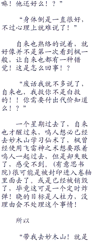 自来也死了之后,鸣人就会去妙木山学习仙术,枫好像已经看到鸣人被那一只老蛤蟆打得鼻青脸肿的事情了!
