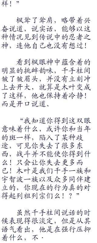 “熟悉的力量!这种复杂的图形,这不是普通的写轮眼,而且这查克拉的波动·宇智波一族的少年,你也和斑一样,得到了永恒万花筒写轮眼吧!?”