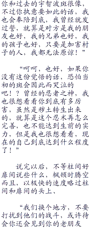 “别给我说这些,没有发生政变,也就是说宇智波一族在什么都没有做的情况下被你们给灭了!?真是让我大开眼界啊!既然没有发动的话,一切不是都可以坐下来好好的谈谈么!?为什么非要做出这样极端的事情来!?”