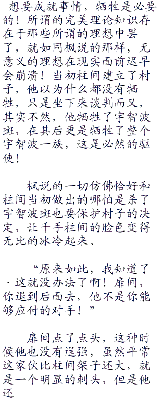 “事到如今你还指望说还能够解决什么么!?别太天真了啊!我总算明白了宇智波斑为什么这么何不不对头了,那不仅仅是因为命中注定,问题而在于你,你把什么事情都想的太简单了!”