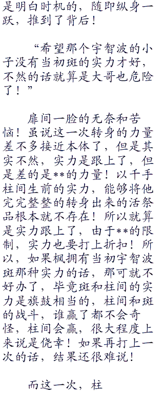 这一瞬间,柱间仿佛在枫的身上看到了当初斑的影子,不,是比斑更加的恐怖,更加的具有野心,更加的不详的感觉!