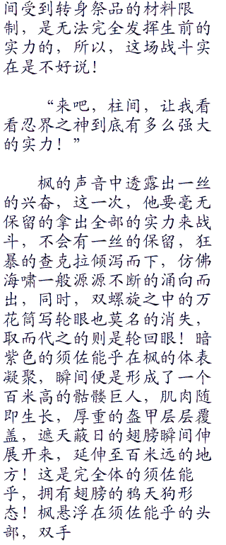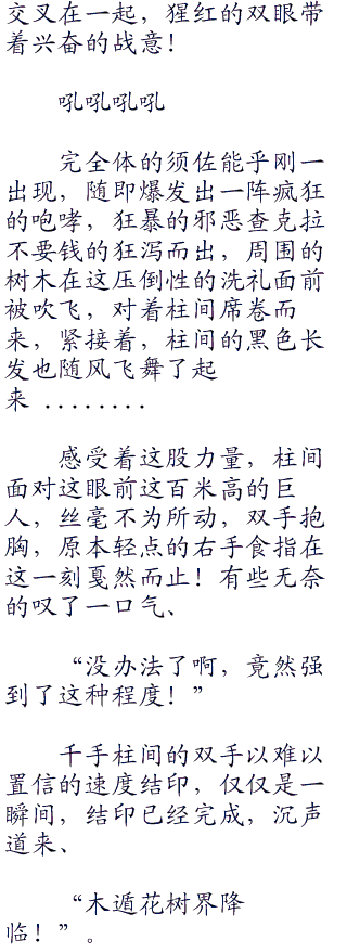 枫双手微微张开,恐怖的查克拉看似潘生,此时此刻的他总算能够放开手脚的大战一场了,眼前的人不就是最棒的对手么!?