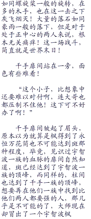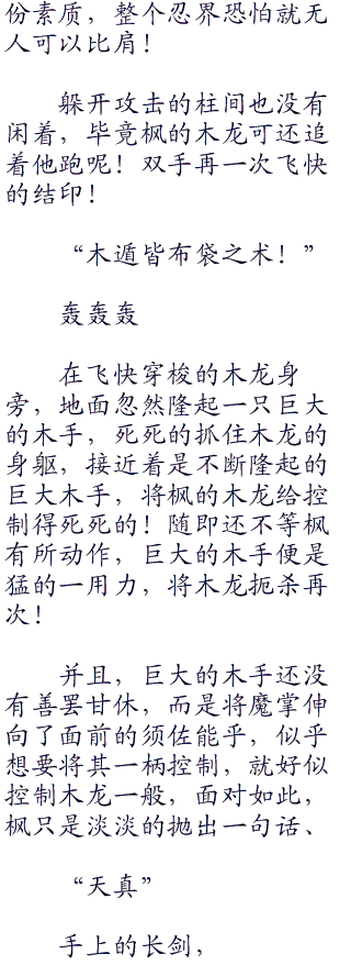 木龙瞬间缠绕住柱间的木人,柱间知道,一旦被缠住,这个木人已经不可能使用了,于是纵身一跃,想要跳下去,可是枫会错过这个机会么!?显然不可能!