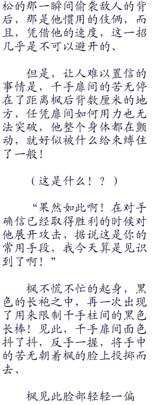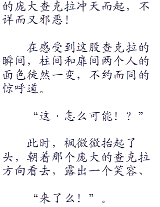 枫伸出右手,从晓的制服之中,一个黑棒赫然出现,这是枫利用轮回眼制作出来的武器,具有压制秽土转生的力量!曾经斑就是用这个限制了柱间的力量,并且还夺走了他的仙人查克拉!同理,斑可以做到,枫没理由做不到、