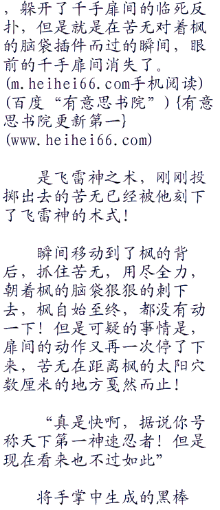 枫的话刚一说完,一道漆黑的身影忽然出现在了枫的背后,速度简直快到难以置信!漆黑的苦无直指枫的心脏!