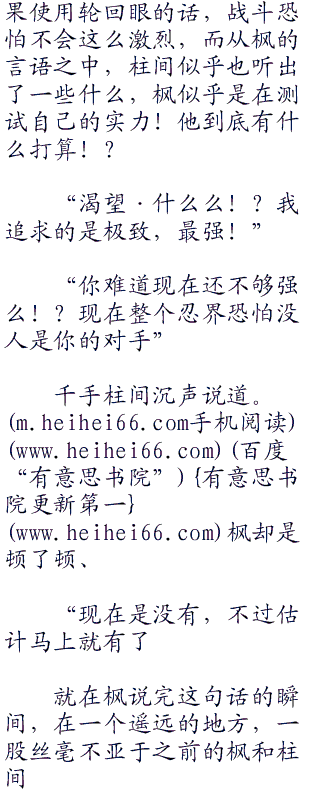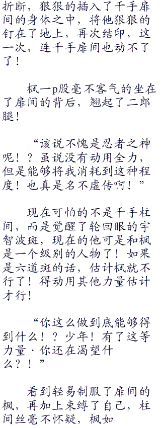 千手柱间全身都陷入麻痹之中,抬头看向了枫,他可以感觉到,枫现在的查克拉也差不多快了,也就是手,如果柱间从秽土转生中恢复过来的话,那枫就无论如何都会失败了!?不过,如果是单论战斗的话,毫无疑问是枫的胜利,而且还是在没有动用轮回眼的情况下!可是现在的柱间是杀不死的