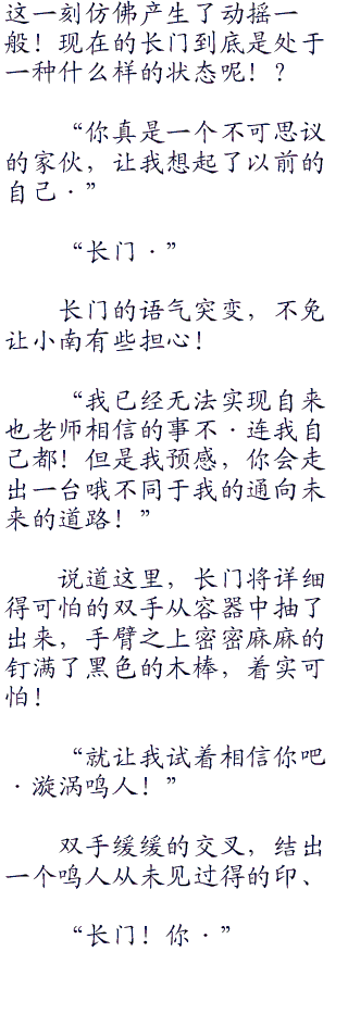 看到长门异常的反应,小南紧张的问道!但是长门的目光却只是停留在鸣人身上!