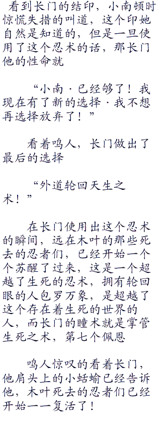 木叶外围,最高的山丘之上,在那由小南纸片忍术构造的巨大树木的内部,有着三个人,鸣人,长门以及小南!
