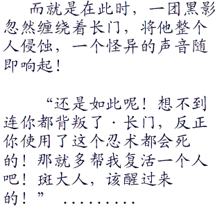 “没错,刚才那些话,全都是出自这本书!好色仙人写的第一本书!好色仙人似乎真的是想用这本书来改造世界!在书的末尾,他写了这本书的灵感其实是来自于他的第一个徒弟!名字嘛·叫长门!就是你啊”