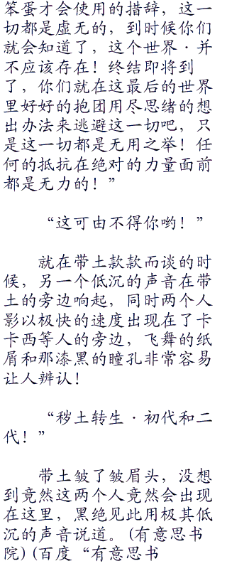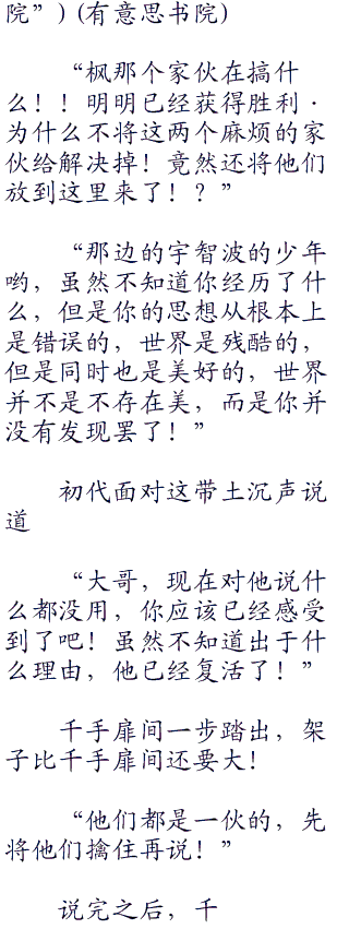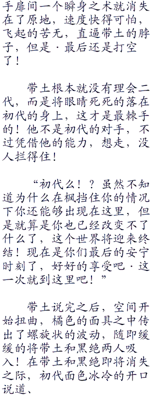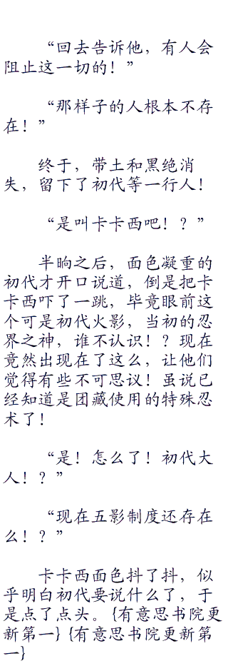 “提醒你一句,卡卡西,毋妄言!只会逞口舌之快的,那只是失败者,不要说那些没有意义的也没有价值的话了!现实·往往都是残酷的!见过世事沉浮的你应该能够理解吧!在这个世界上,愿望都是实现不了的!无奈,空虚,冷漠,尔欺我诈,背叛,恐惧,绝望,战争·这就是这个世界的真相!”