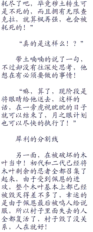 “鼬的眼睛,我留着也没有什么作用,他的眼睛已经近乎瞎掉了,根本不能用,只能用来移植!轮回眼还没有交给斑,初代和二代还在,这个