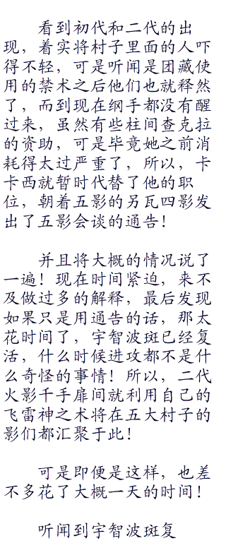 佐助眉头紧皱,显然没有从这个庞大信息量中反应过来!权衡了一下,既然木叶已经毁了,那就没有去的必要了!既然这样,那就应该直接追团藏才是上上之策!毕竟,他才是害死了鼬的罪魁祸首!