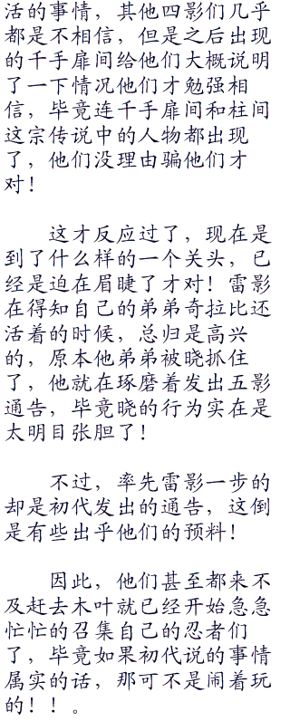 闻言,佐助挑了挑眉毛,他看出了似乎带土很焦急,不惜做到这一步也想到得到九尾,这是为了什么!?为什么他不自己出手,他刚刚说的必须要亲自做的事情是什么!?到底又在策划些什么!?