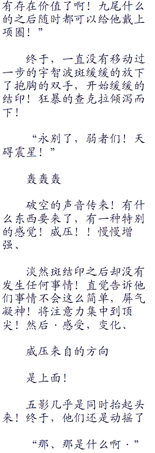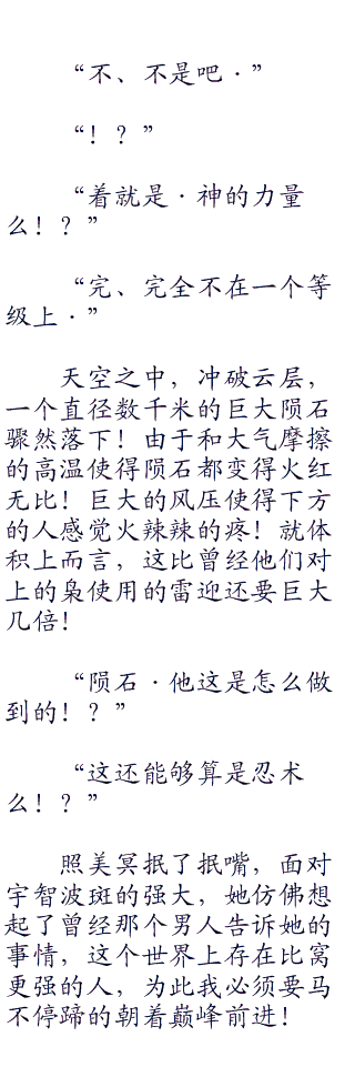 小小的身影在视觉上远不如尾兽或是须佐能乎什么的给人来的震撼,但是其压倒性的存在感却是仿佛超越了生死一般!周围一片死寂,没有一个人敢大声说话!