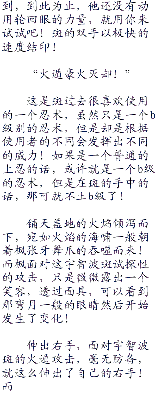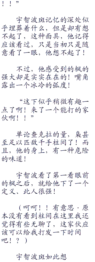 枫以枭的身份的出现,无疑是震撼的,宇智波斑看到他之后,不免有些皱了皱眉头·