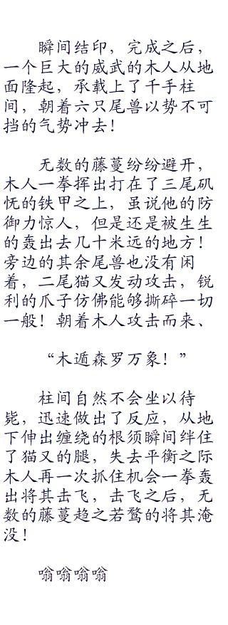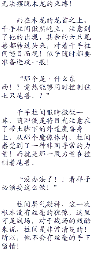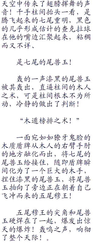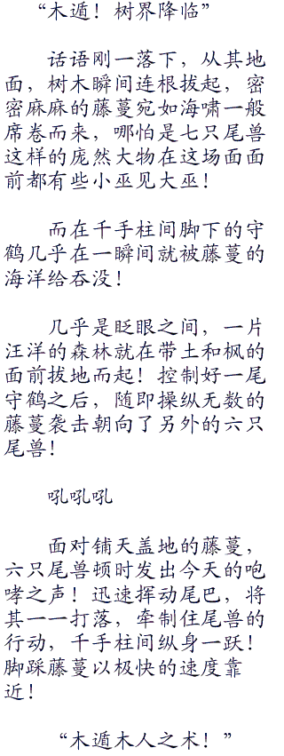 龙从天降!一条巨大的木龙蜿蜒盘旋以极快的速度飞驰而来,从一个非常刁钻的角度将一尾守鹤给缠住!守鹤顿时怒吼一声!猛的挥动背后的尾巴,想要摆脱,可是木龙根本不给他机会!死亡一般的缠绕将守鹤尾巴死死的束缚!