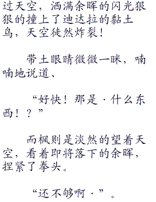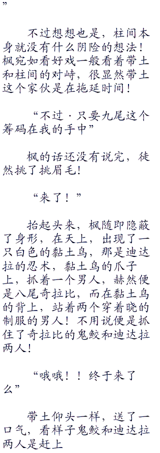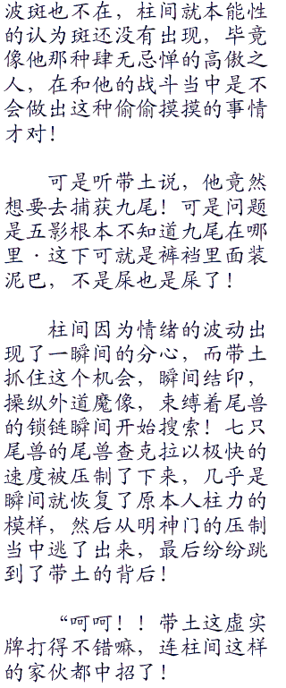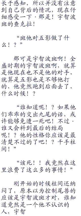 “意义!?别给我提这个词语,没有经历过绝望你又怎么会知道,这个世界已经无所谓希望和意义了!希望和放弃已经没有任何的区别·那只是一种敷衍和说辞而已!这个世界马上将会迎来终结,虽说我不知道你为何会出现在这里,但是如果你出现在这里·也就是说,原本该作为你对手的家伙正在你的后方大杀特杀吧,马上八尾和九尾就会汇聚于此,你什么都做不了!柱间”