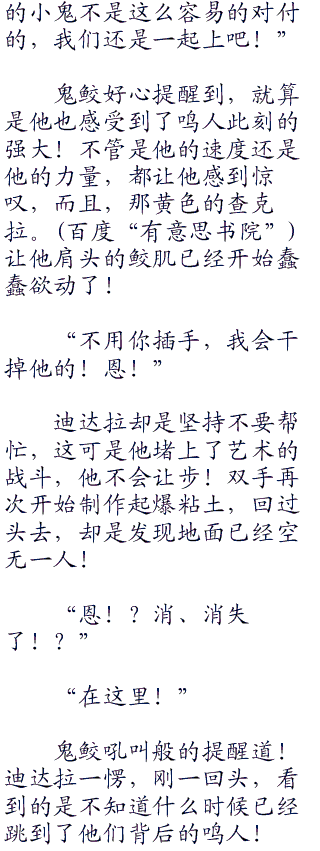 听了迪达拉的话,鬼鲛倒是挑了挑眉毛!