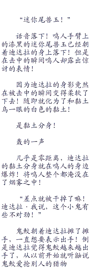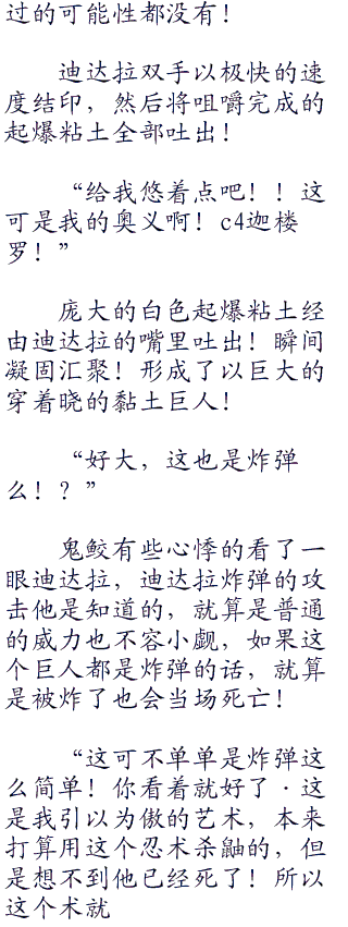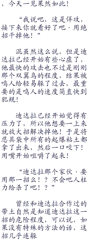 迪达拉点了点头,操纵着黏土鸟飞向了鸣人的上空,双手放在两旁的忍具袋里面,手掌上的黏土鸟不断的啃食着起爆粘土!