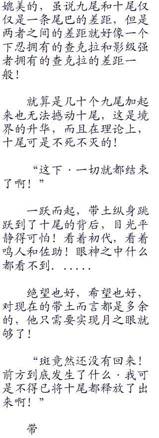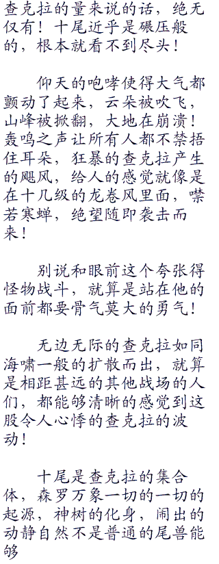 庞大得无边无际的,划破烟雾,冲开天际,厚重的身躯,光是其存在感就是压倒性的强大,填满整个眼球的,首先是十条尾巴随风摆动!