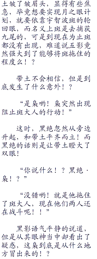鸣人和佐助两人纷纷用手挡住脸,露出一丝缝隙才得以观察眼前的名为怪物的东西!