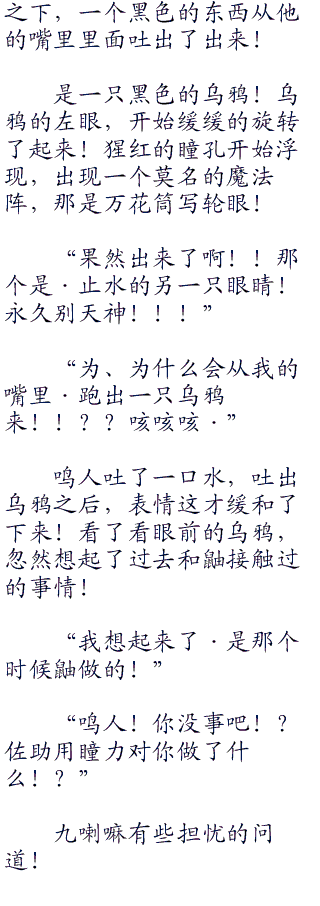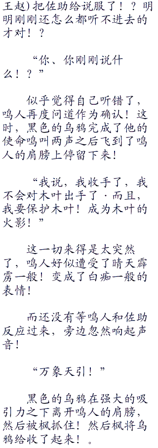 “你错了,鸣人,我这是在斩断一直在折磨着哥哥束缚的枷锁,如果不是木叶的话,我哥哥也不会走到这一步!我是复仇者,现在说什么都没有用了!我要杀了你,让后去血洗了木叶!”
