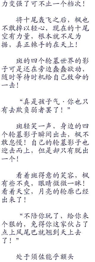 轮回眼之中带着的是莫大的战意,现在可真是起兴的时候!瞬间张开暗紫色的须佐能乎的翅膀,枫就想要腾空而起!