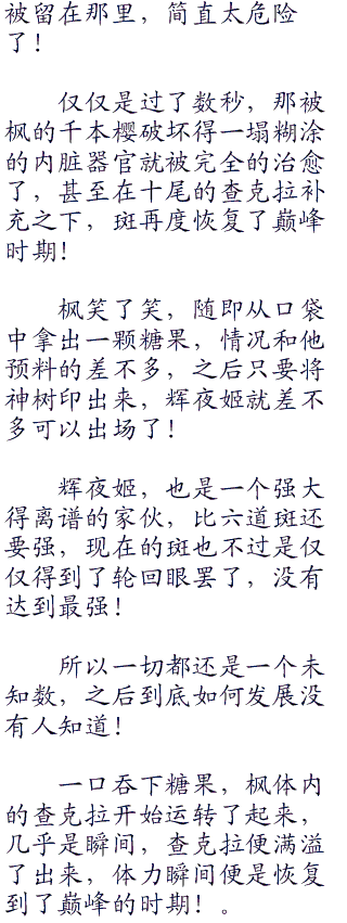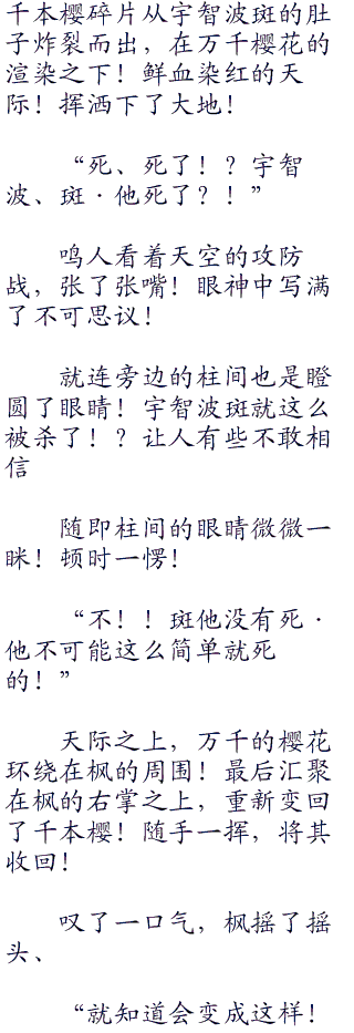 枫扬了扬头,嘲讽一般的说道!凋落而下的樱花似乎让宇智波斑想起了什么一般!瞬间低头看着自己胸膛上插着的千本樱!