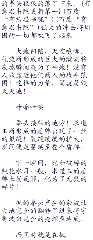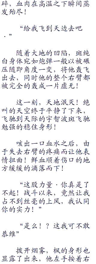 无形的冲击在两人之间形成,随即形成奔腾的热浪扩散而出,斑随即宛如一个断线的风筝一般狠狠的射向了地面!