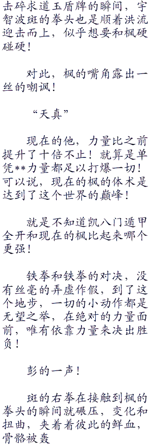 想要用轮墓边狱来抵抗已经来不及了,在这紧急情况之下!斑只有高举双手用自己的胳膊来挡住枫疯狂的一击!