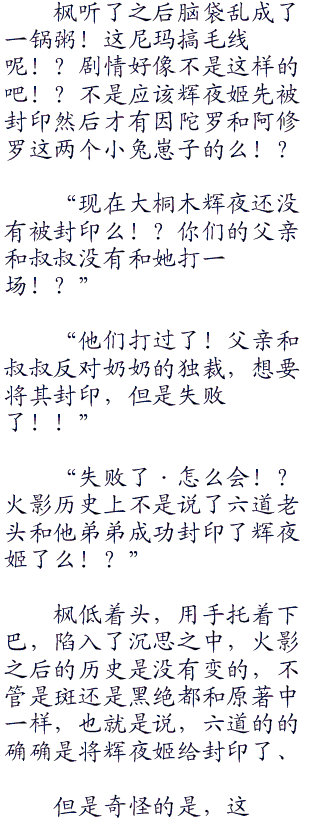 枫一拍头,立刻就明白了这个是什么时代,辉夜姬统治的时代,诶·不对!既然六道有了因陀罗和阿修罗,也就是说,辉夜姬已经被封印了么!?