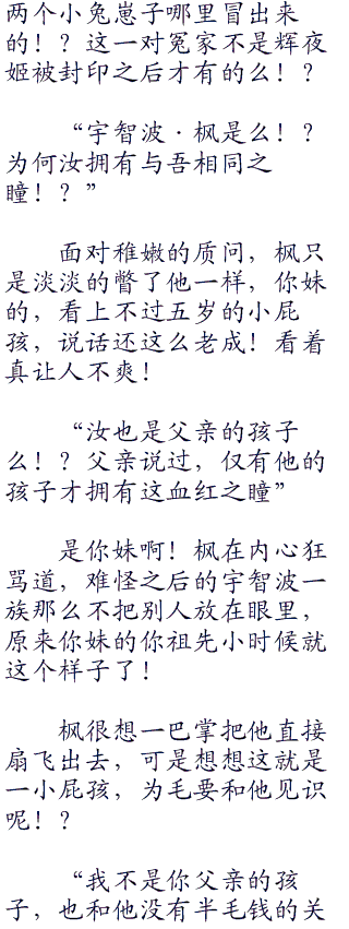 枫顿时用写轮眼观察,发现这两个小孩身体里面都具有庞大得可怕的查克拉!其中一个的眼睛更是一片血红!赫然看起,不就是三勾玉的写轮眼么!?