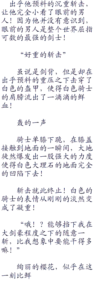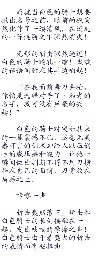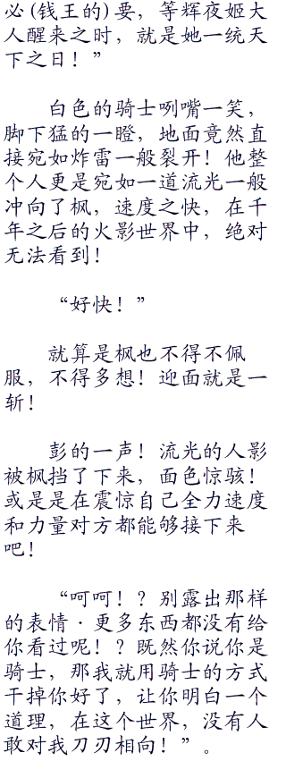 枫不免有些吐槽!但是白色的骑士显然没有管枫的表情和话语,而是自顾自的继续用鼻音说道、