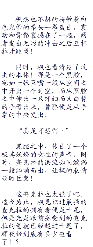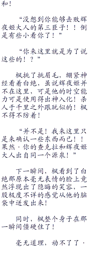 枫皱了皱眉头,随即瞳孔猛的缩小到针状大小!(是后面!)