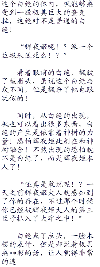 而且,白色骑士的身体竟然仿佛秽土转生一般开始逐一**!枫也能够感受到,骑士的查克拉再以一种极快的速度流逝着!