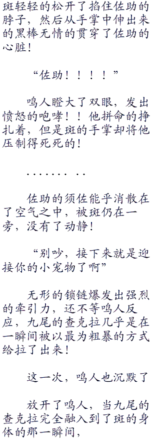 而就是在斑想要攻击柱间的时候,被掐住脖子的佐助却是发出了咆哮!!
