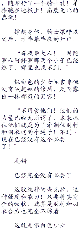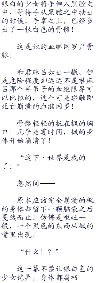 但是此刻,那些查克拉却通过枫的腹部延伸到了银白色的少女的朱唇之上!