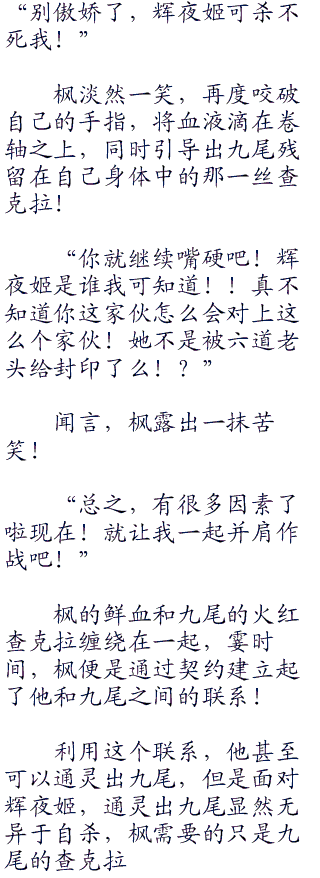 “缔结契约吧,如果你面对的真的是那个大桐木辉夜的话!!就算是我借查克拉给你也无济于事,借给你的查克拉非常的有限!”