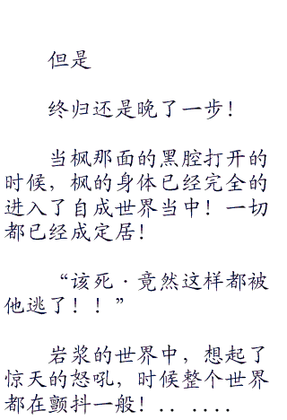 脚下的岩浆泛起了波浪,仿佛火山爆发一般冲天而起,直逼枫的身体而来,对于这一切,枫视若无睹!