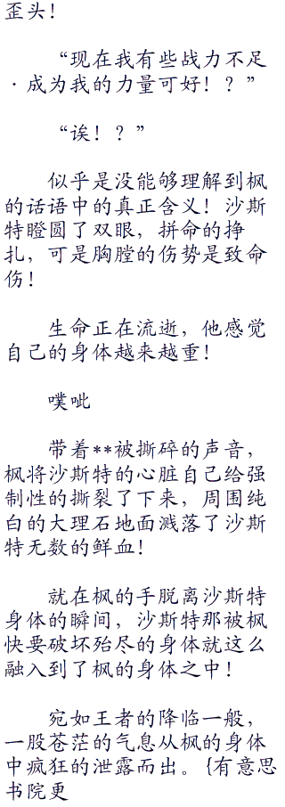 枫咧嘴一下,舔了舔自己脸上溅落的对方的鲜血!歪了