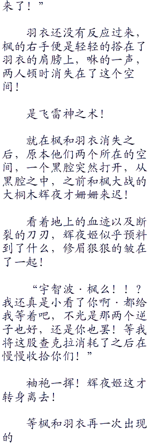 枫咻的一声收回了樱花凋落的千本樱,漆黑的武装色霸气宛如一缕青烟一般消散在剑刃和枫的手掌之上!