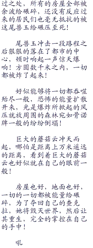 十尾经过之处,一切都变成了废墟!再度经过一个都市!立马就看到了一颗直径上千米的黑色尾兽玉如同炮弹一般朝着都市的中心轰击而去,经