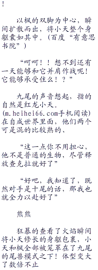 枫冷哼一声,随身一跳,跳掉了小天的头上,同时小天也雀跃的龙鸣起来、