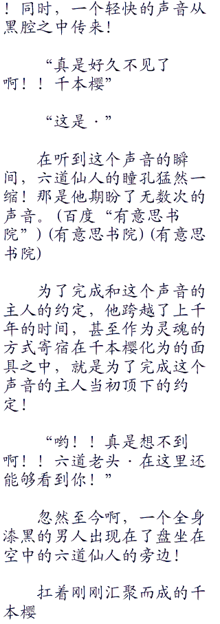 六道抬起头来,看着飞舞的千本樱,感到有些奇怪,倒是旁边的初代等人看着这一幕挑了挑眉毛!