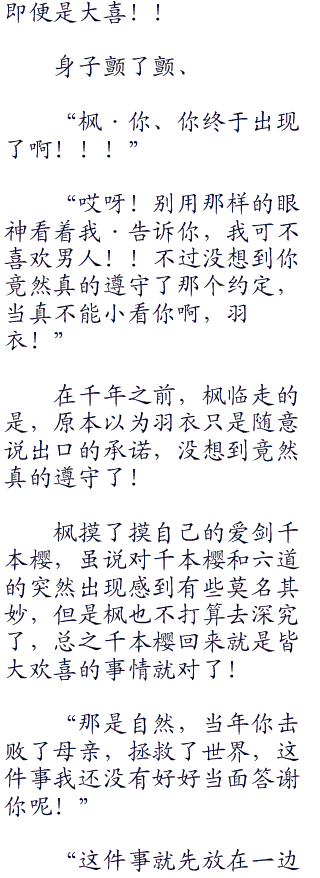 可以说,六道将一切都托付给了这两人,拯救世界什么的,已经和他无关了,他现在唯一存在的理由,则是为了完成千年之前和宇智波枫的那个一个临走时的那个约定!