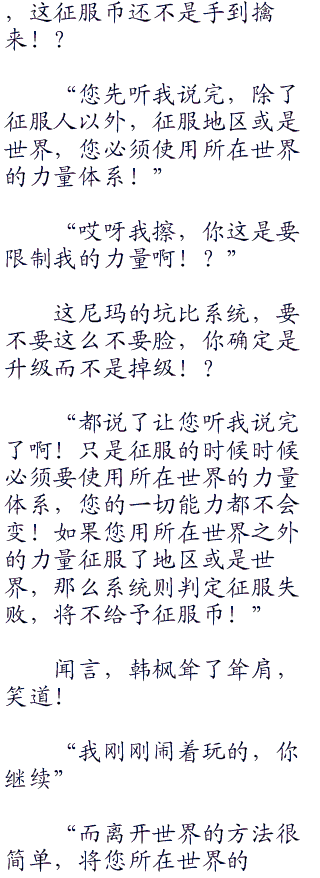 似乎是感受到了韩枫的不爽,系统愣了一下!传出一阵苦笑,随即开始解释道!