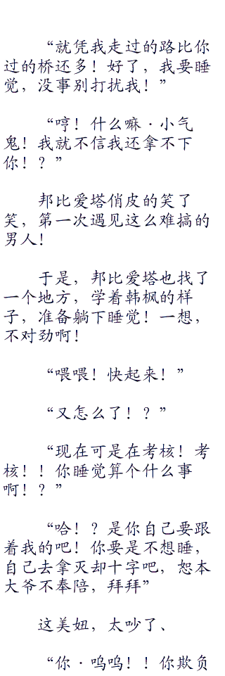 凭什么!?韩枫笑了笑,起身,轻轻的弹了一下邦比爱塔的额头!