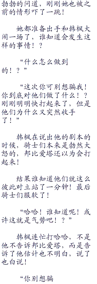 旁边原本刚刚因为韩枫嚣张的话而愤怒无比的六位骑士全都偃旗息鼓了!也不知道在想些什么!