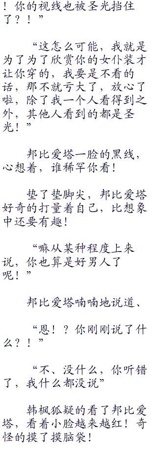“给你解释一下吧,说实话,我以前很讨厌圣光的,那家伙就和马赛克一样阴魂不散,不过用在这里正好!圣光,顾名思义就是一道光,说白了就是用来挡住关键部位的!”